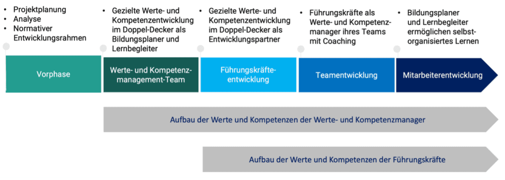 Der Implementierungsprozess dieses Future Learning ist nach dem Prinzip zu gestalten, möglichst rasch die Werte und Kompetenzen der Schlüsselpersonen, der Werte- und Kompetenzmanager als Bildungsplaner und Lernbegleiter sowie der Führungskräfte als Entwicklungspartner ihrer Mitarbeiter aufzubauen. Diese Entwicklungsprozesse erfolgen dabei im Doppel-Decker-Prinzip, so dass diese Schlüsselpersonen werte- und kompetenzorientierte Lernkonzeptionen zunächst als Lerner erleben, um aus diesen Erfahrungen heraus ihre eigenen Konzeptionen der Mitarbeiterentwicklung zu gestalten und umzusetzen.