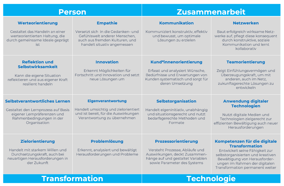 - Werte und Kompetenzen für die digitale Transformation aufbauen Digitale Kompetenzen setzen zwar Wissen über digitale Systeme im Arbeitsprozess und die Qualifikation zur Nutzung dieser Systeme voraus, umfassen jedoch deutlich mehr Fähigkeiten. Digitale Kompetenzen– eigentlich Kompetenzen für die digitale Transformation – sind die Fähigkeiten, in der sich neu herausbildenden digitalen Arbeits- und Lebenswelt Herausforderungen, die zum großen Teil heute noch unbekannt sind, selbstorganisiert und kreativ lösen zu können.