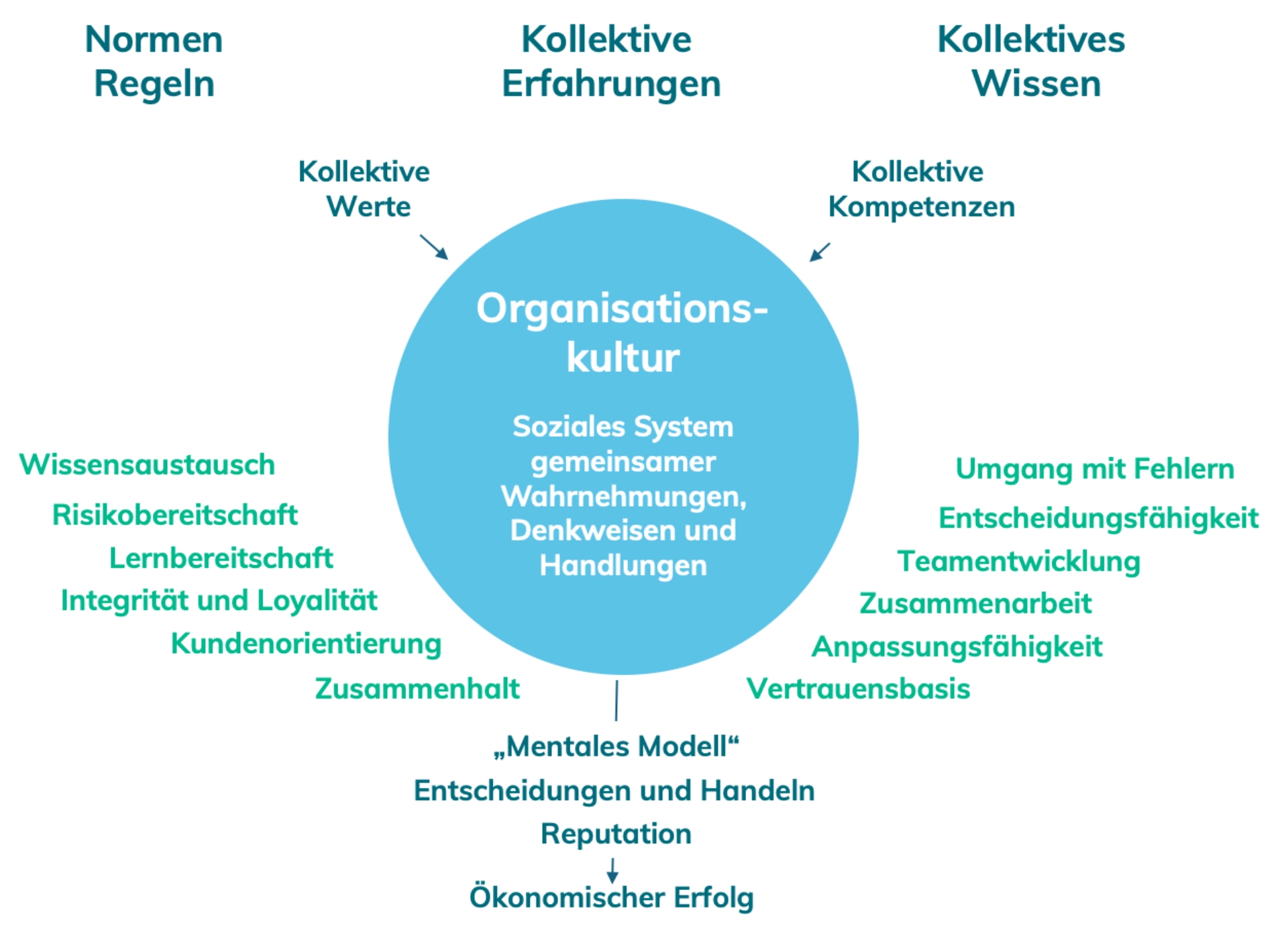 Organisationskultur ist ein soziales System von gemeinsamen Wahrnehmungen, Denkweisen und Handlungen, die die Entscheidungen sowie das Handeln der Mitarbeitenden auf allen Ebenen einer Organisation prägen und die sich als „gemeinsames mentales Modell" erweist.