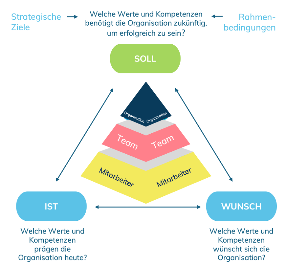 - Wunsch: Wie müssten die Werte und Kompetenzen nach Meinung der Mitarbeitenden in der Organisation ausgeprägt sein, damit sie die zukünftigen Herausforderungen erfolgreich bewältigen wird?