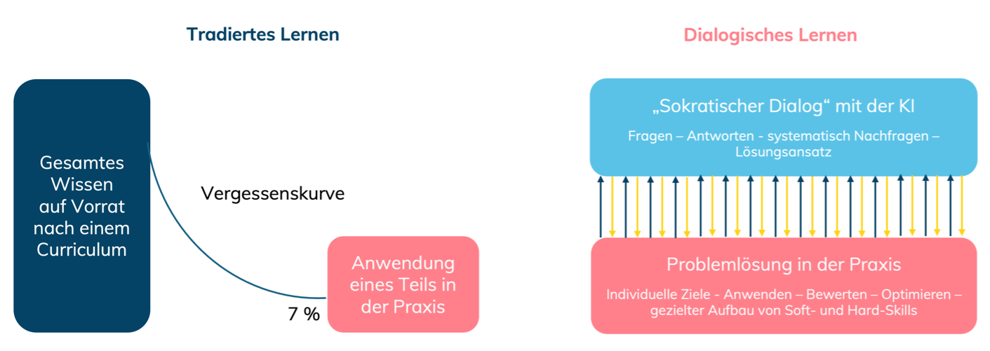 Dieses dynamische Lernen unterscheidet sich grundlegend von herkömmlichen Methoden. Während bei klassischen Schulungen weniger als 10 % des Gelernten tatsächlich in die Praxis umgesetzt werden, erfolgt das dialogische Lernen direkt in der Anwendung – es wird damit nachhaltig in den Arbeitsprozess integriert.
