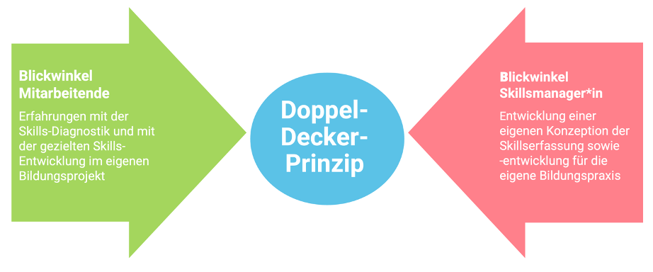 Der Aufbau der Werte und Kompetenzen der Lernbegleitenden, aber auch der Bildungsplanenden bzw. Personalentwickelnden, setzt voraus, dass diese Zielgruppe die Social Blended Learning Konzeption bereits selbst als Lernende erfahren hat, um aus ihren eigenen Erfahrungen heraus ihre individuellen Bildungskonzeptionen für ihre Zielgruppen abzuleiten. Hierfür hat sich ein online-basiertes Blended Learning Konzept, das sich durch eine ausgeprägte Selbstorganisation und dem „Doppeldecker-Prinzip“ auszeichnet, bewährt.