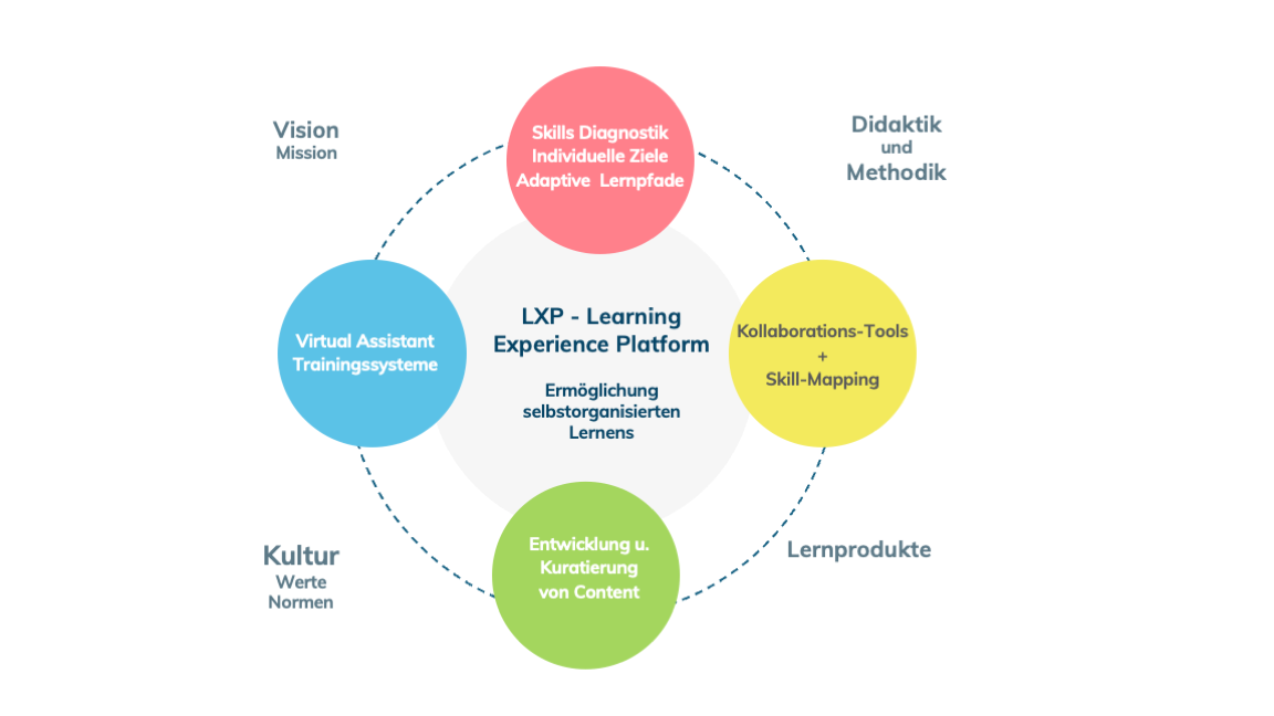 Die LXP ist deshalb in die Lernstrategie sowie die Lernkultur eingebettet und umfasst folgende Bereiche: