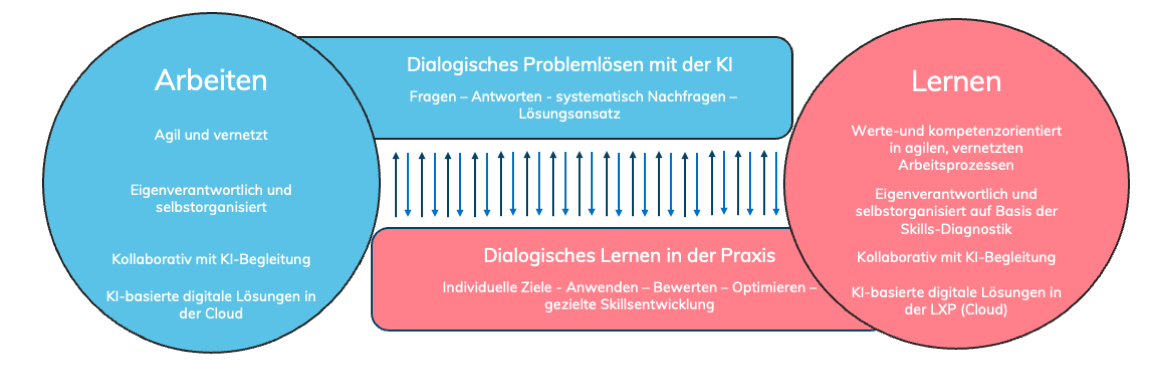 Künstliche Intelligenz (KI) wird als persönlicher Lernpartner für dialogisches Lernen genutzt werden. Dies bedeutet, dass die Mitarbeitenden ihre Lernprozesse bei der Bewältigung von Praxisaufgaben parallel zum Prozess des Wissensaufbaus planen. Damit findet das Lernen von Anfang an vor allem in der Praxis statt, das notwendige Wissen wird durch gezielte Fragen und Antworten an die KI sukzessive für die Lösung dieser Herausforderungen aufgebaut und direkt angewendet. Merkt die Mitarbeitende dabei, dass sie noch nicht alles verstanden hat, kann sie umgehend nachhaken.