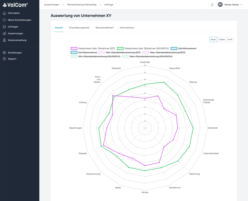 - ValCom® Organisation: Werte- und Kompetenzerfassung Ist und Wunsch in einem Ratingsystem bei allen Mitarbeitenden einer Organisation